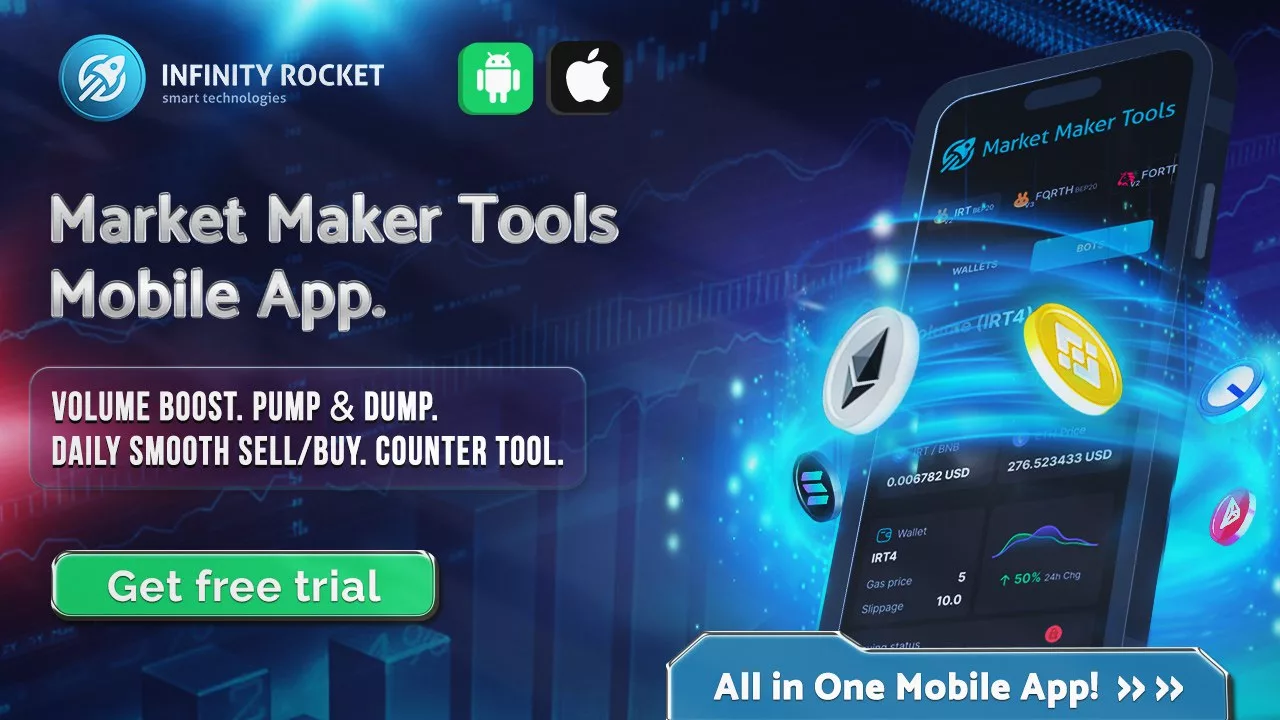 🔥 You can work with numerous wallets at the same time (up to 100 bots). Market Maker Tools from Infinity Rocket: we assure you that this app is a blockbuster for market makers.